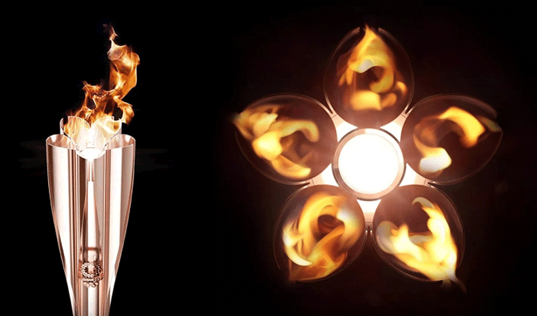 火炬外形的靈感來自于日本國花——櫻花,火炬采用了和日本新干線列車相同的高端制作工藝,整體呈粉亮質感的“櫻花金”色。火炬的頂部被設計成花櫻花花瓣狀,火種將先從 5 個花瓣分別燃起再匯聚到中心位置后形成圣火。